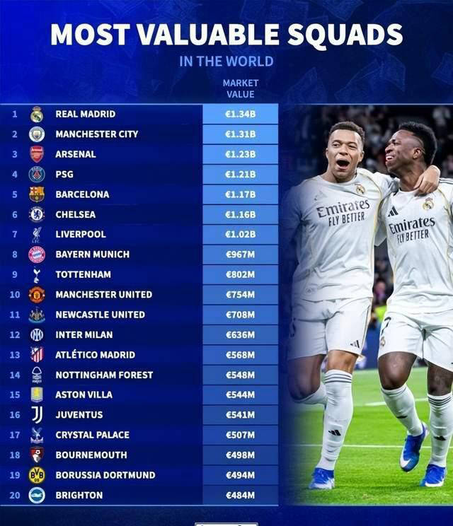 德国转会市场公布最新一期全球俱乐部身价排行榜,显示皇马以13.4亿欧元高居榜首,曼城紧随其后,身价达到13.1亿欧元,阿森纳以12.3亿欧元位列第三,巴黎圣日耳曼和巴萨分别以12.1亿欧和11.7亿欧名列四五位。相比之下,国际米兰虽然是意甲传统豪门,但仅排在第12位,俱乐部身价为6.36亿欧元,明显落后于其他欧洲顶级俱乐部。此数据不仅反映了俱乐部的市场吸引力,也揭示了国际米兰目前在转会市场中的竞争压力。